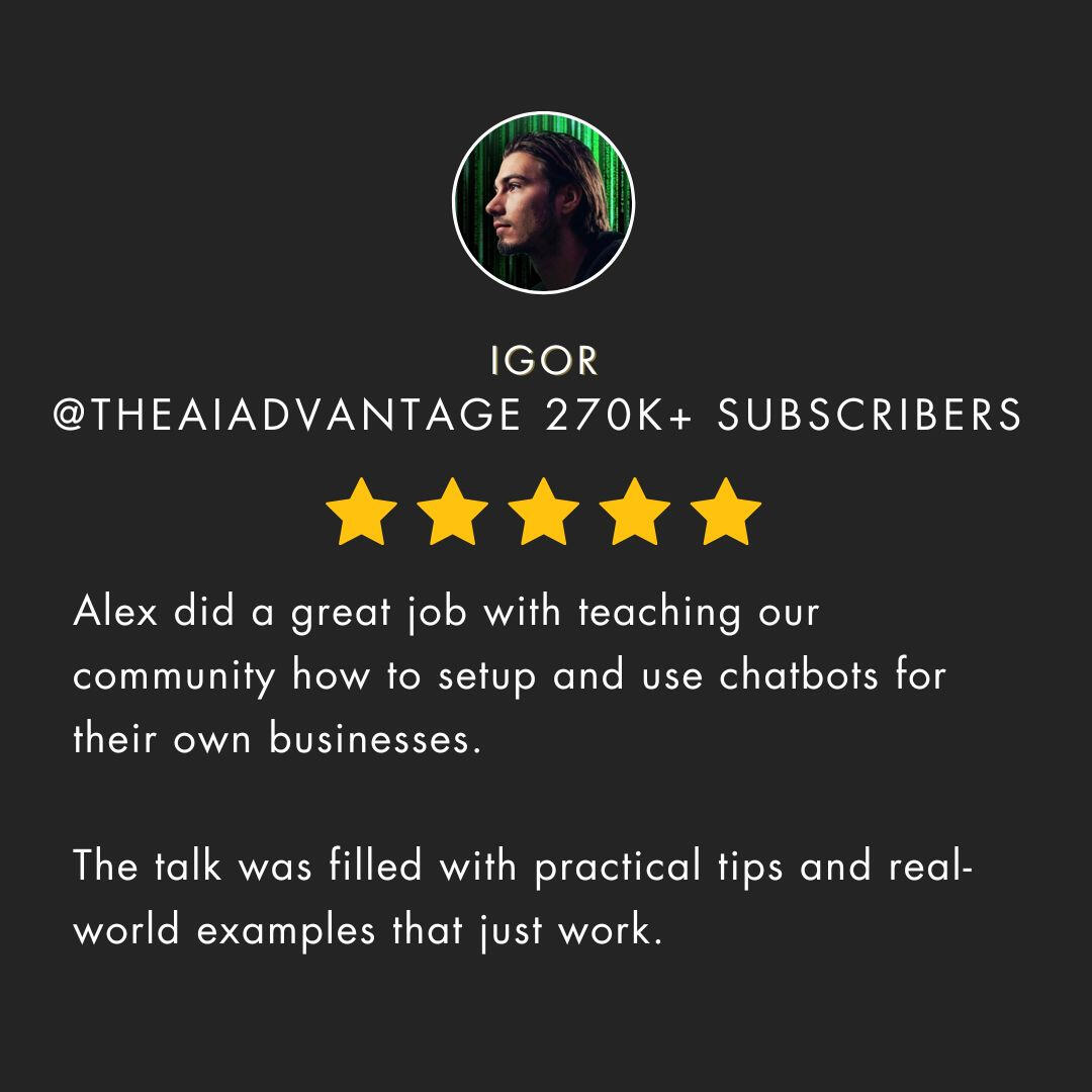 I know you want to learn AI and put it to work for you. Cut through all that overwhelm and anxiety. Get the shortcut, apply what really works and get results.To win back your precious time, enjoy life and earn more.Because I checked around and so many of the "AI gurus" just throw at you 10.000 prompts...and 98% are useless and fake.So I decided to take the opposite approach:Teach practical AI to smart humans, live. Face to face.I already did it in Las Vegas and Cornell Tech, New York in front of 500 business leaders and they loved this material."Meat and potatoes" of AI.And now I look forward to helping you become an AI Power User with chatbots, tailored workflows, and the best selected AI tools to make more money, save hours each day, and triple your effectiveness.I'm opening up my limited workshop for October, where I help a small group of ambitious but busy professionals, creators and entrepreneurs, go from AI Confused to AI Power User in 1 session and win their time back.BEGINNER friendly. BUT this is NOT a theory presentation. We will use ChatGPT, Voiceflow and other tools. No coding skills required.So if you want to join the 5th round of this results-driven AI pro group, led by a productivity and AI automation expert, I'd recommend you act FAST.The next workshop round will be $400."Why you?" you might be asking.Because I've been doing workshops for professionals since 5 years, for companies like Google, as an ex Google Ads trainer, I did AI workshops in New York and Las Vegas, and I also did workshops for the communities of AI thought leaders and creators, like the AI Advantage (250.000+ subscribers on Youtube).