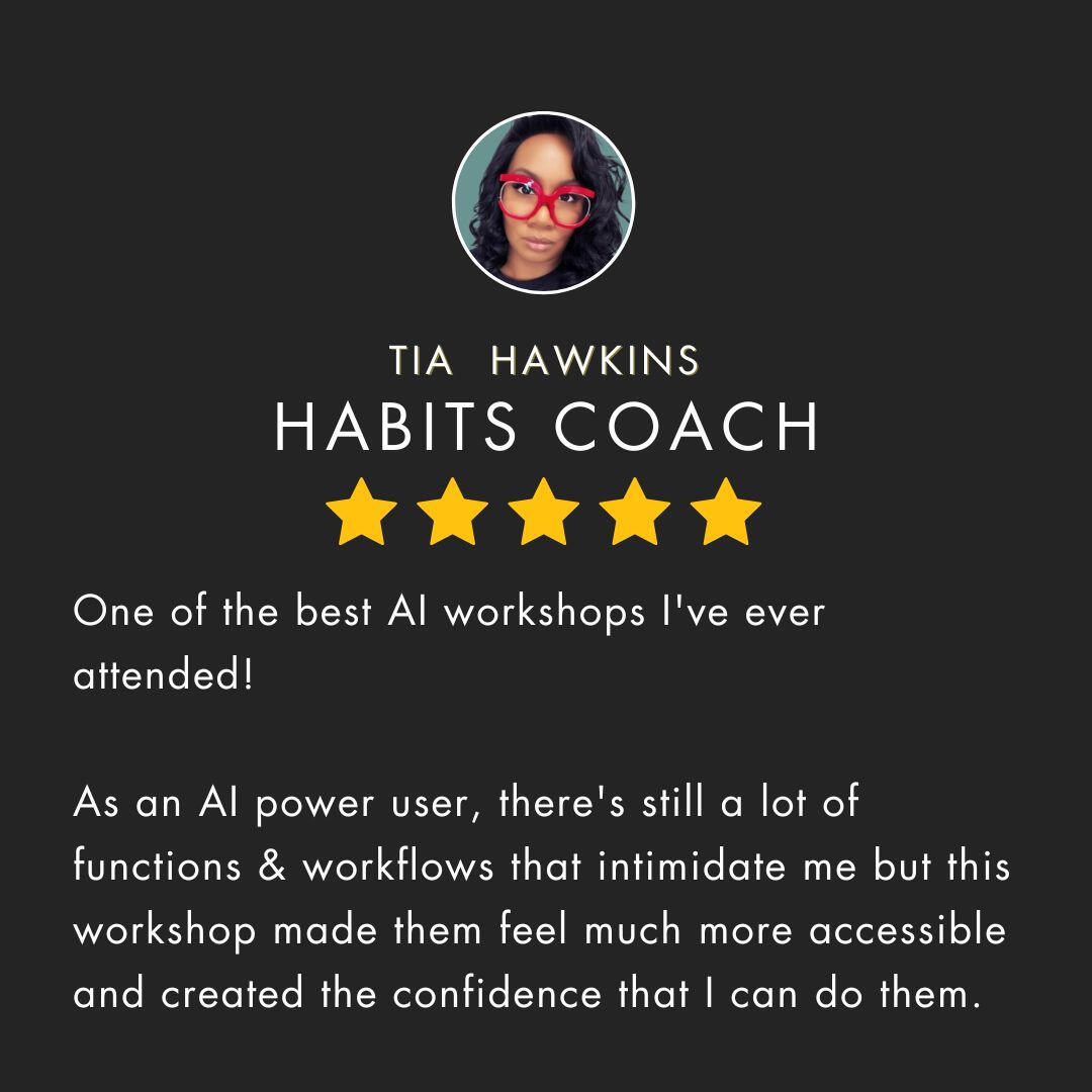 Workshop material will be available to you forever (value $2500)✅ Exclusive "AI Powerhouse" Masterclass:Receive my collection of selected AI tools and workflows specifically designed for solopreneurs and small businesses.(Value: Saves you countless hours of repetitive work)✅ Community & support:Network with like-minded entrepreneurs and get ongoing support from me and the cohort throughout your implementation journey.(Value: Priceless – having a supportive community can be a game-changer)From AI Confused to AI Power User in 1 session (max 10 spots)