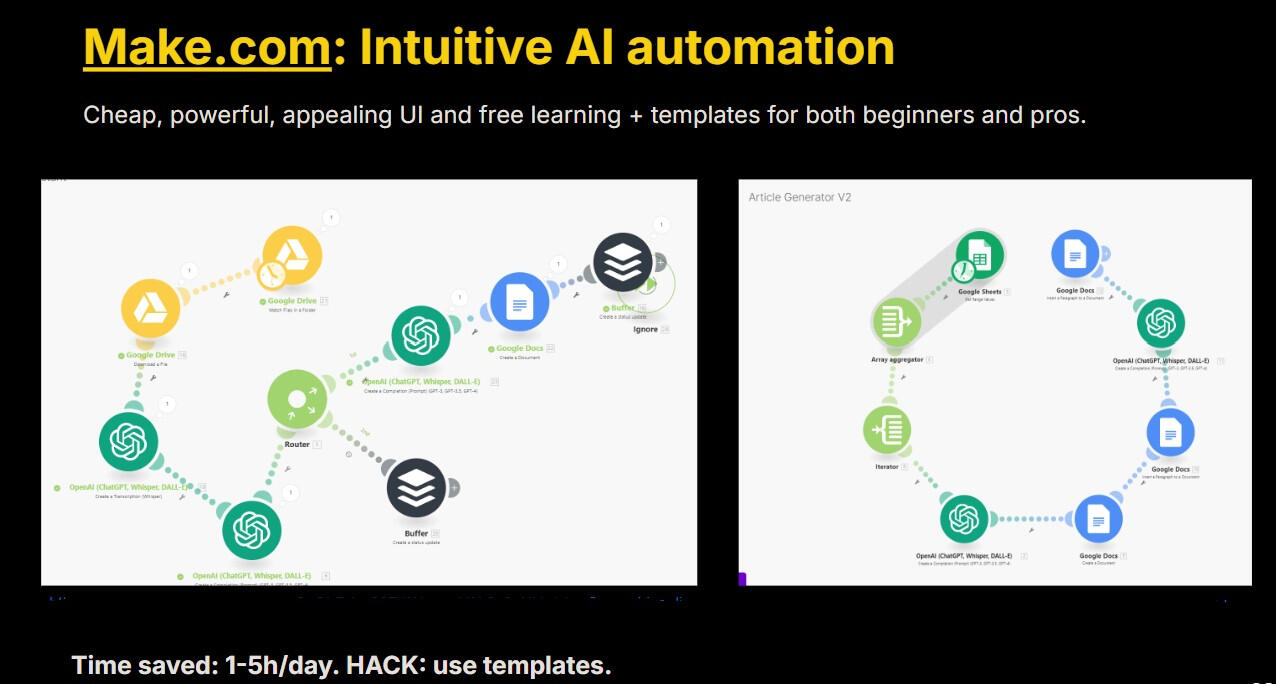 You get YOUR valuable time back to enjoy human life or get ahead. Simple.But also:✅ AI foundations & time audit:Discover the most powerful AI tools for your business and conduct a personalized time audit to pinpoint your biggest time-wasters.(Value: Estimated 5 hours saved per week identifying automation opportunities)✅ AI task automation mastery:Automate repetitive tasks. We'll build custom AI workflows that free you up for more strategic work.(Value: Estimated 4 hours saved per week on repetitive tasks)✅ AI content creation & marketing:Leverage AI to generate content ideas, draft social media posts, and personalize marketing campaigns. Get ready to attract more clients with less effort.(Value: Estimated 5 hours saved per week on content creation and marketing)✅ Make.com walkthrough and monetization:Learn the easiest and best way to build powerful AI automations for yourself, your business and your clients. You will get my templates too (Value: $3000 – I already made much more than that since I started using it).