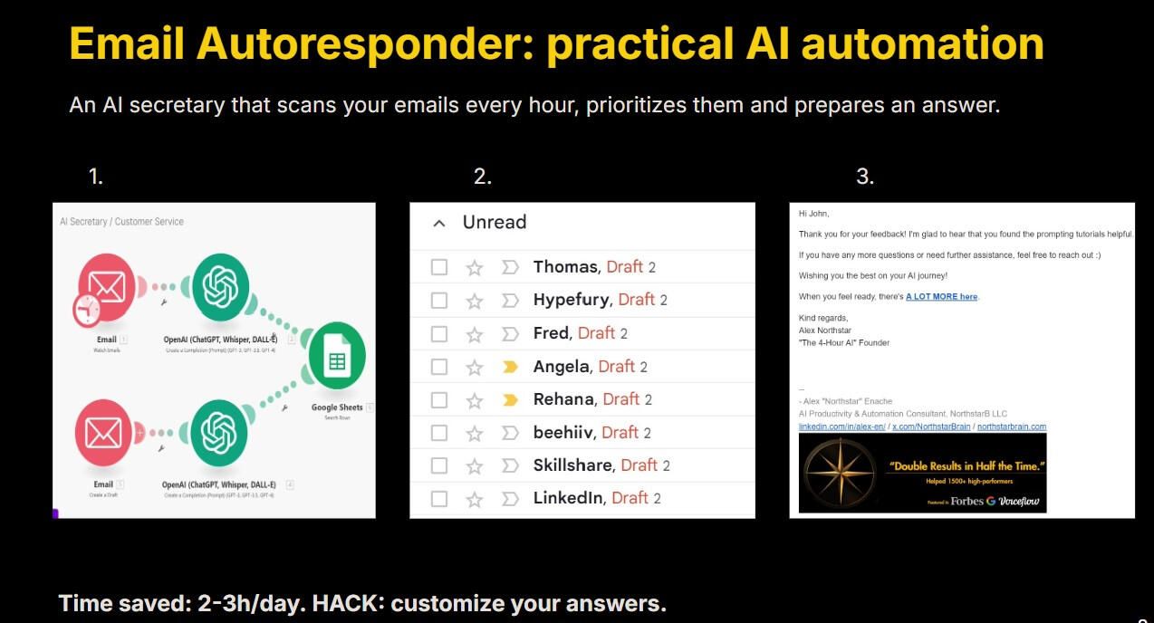 ✅ An email autoresponder agent to STOP your ENDLESS email grind.Busy managers and business owners LOVED this one (I'll guide you through Make.com, the cheapest platform for automations)I'm not teaching you principles or theory.
